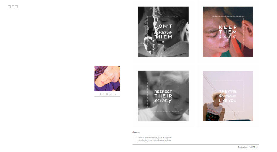 These are themes I've used on my blog, hyoyn, before. Please do not steal my themes (trust me, they're not worth it anyway) or excessively edit them. If you need a base code, I have one linked on the document button below. If you have any questions or problems, feel free to contact me! Thank you!